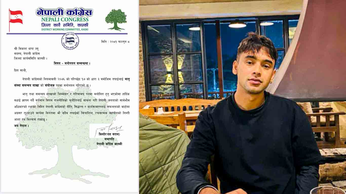 नेपाली कांग्रेस कास्कीका सभापति किशोर दत्त बराल दृारा हस्ताक्षरित पत्रमा नेपाली कांग्रेसको नियमवली २०७६ को परिच्छेद १७ को धारा ३ वमोजिम मनोनयन गरेको जनाईएको छ !