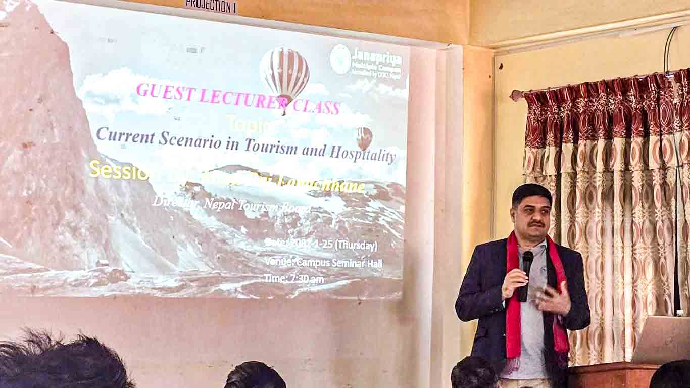 पोखरा | जनप्रिय मल्टिपल क्याम्पसमा “नेपालको पर्यटन नीति र प्रचारात्मक गतिविधिहरू” विषयक शिर्षकमा “गेष्ट लेक्चर” सम्पन्न भएको छ । नेपाल पर्यटन बोर्डका निर्देशक मणि राज लामिछाने वत्ता रहेको सो कार्यक्रममा गण्डकी प्रदेशको पर्यटन र पोखरा अन्तर्राष्ट्रिय विमानस्थल सञ्चालनमा विशेष ध्यान केन्द्रित गर्दै नेपालको पर्यटनको वर्तमान परिदृश्य विषयमा बोलेका थिए ।